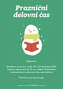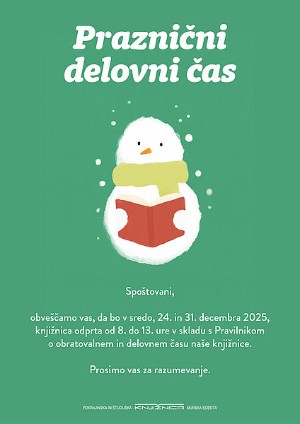 obveščamo vas, da bo v sredo, 24. in 31. decembra 2025, knjižnica odprta od 8. do 13. ure v skladu s Pravilnikom o obratovalnem in delovnem času naše knjižnice.